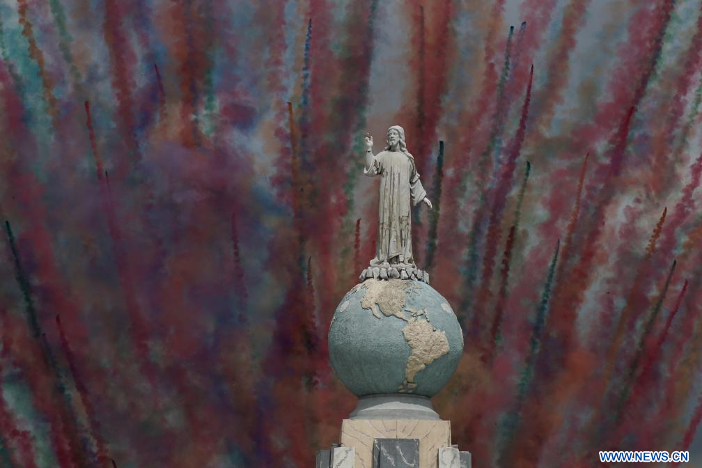 SAN SALVADOR, 1 agosto, 2023 (Xinhua) -- Imagen del 1 de agosto de 2023 del monumento al Divino Salvador del Mundo rodeado de fuegos artificiales durante un desfile en el marco de la inauguración de la temporada vacacional de las fiestas agostinas, en el departamento de San Salvador, capital de El Salvador. (Xinhua/Alexander Peña)