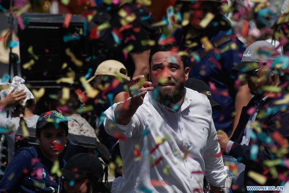 SAN SALVADOR, 1 agosto, 2023 (Xinhua) -- El alcalde de San Salvador, Mario Durán, lanza dulces y chocolates a personas durante un desfile en el marco de la inauguración de la temporada vacacional de las fiestas agostinas, en el departamento de San Salvador, capital de El Salvador, el 1 de agosto de 2023. (Xinhua/Alexander Peña)