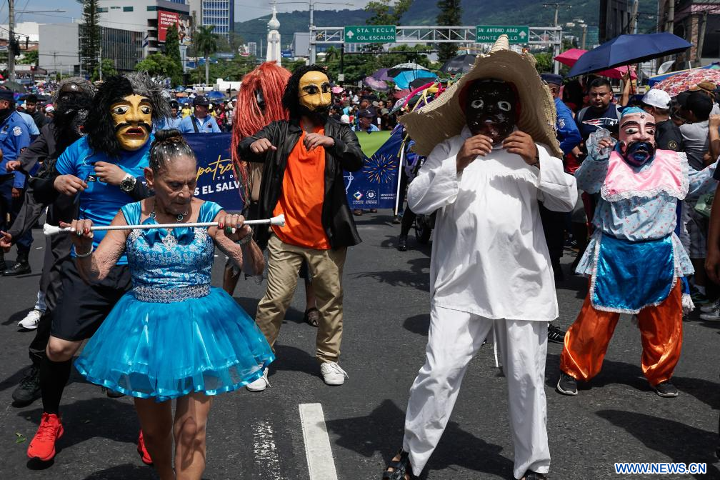 SAN SALVADOR, 1 agosto, 2023 (Xinhua) -- Personas portan trajes de personajes mitológicos mientras participan en un desfile en el marco de la inauguración de la temporada vacacional de las fiestas agostinas, en el departamento de San Salvador, capital de El Salvador, el 1 de agosto de 2023. (Xinhua/Alexander Peña)