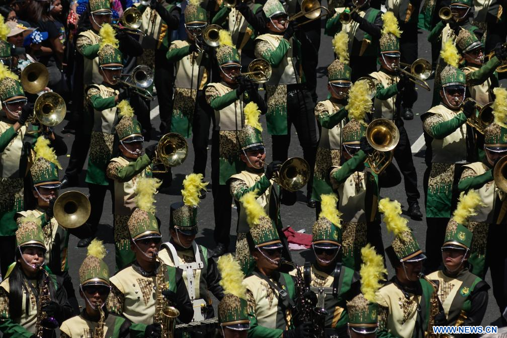 SAN SALVADOR, 1 agosto, 2023 (Xinhua) -- Integrantes de una banda musical estudiantil realizan una presentación durante un desfile en el marco de la inauguración de la temporada vacacional de las fiestas agostinas, en el departamento de San Salvador, capital de El Salvador, el 1 de agosto de 2023. (Xinhua/Alexander Peña)