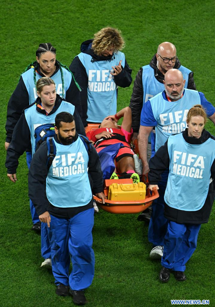 BRISBANE, 3 agosto, 2023 (Xinhua) -- Cho Sohyun, de República de Corea, es transportada en una camilla después de ser lesionada durante el partido del Grupo H entre República de Corea y Alemania en la Copa Mundial Femenina de la FIFA Australia y Nueva Zelanda 2023, en Brisbane, Australia, el 3 de agosto de 2023. (Xinhua/Li Yibo)