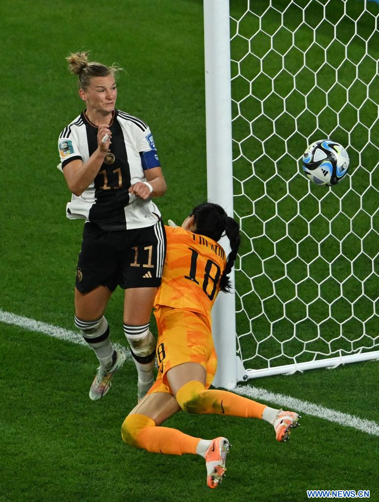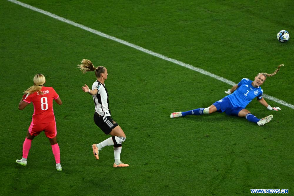 BRISBANE, 3 agosto, 2023 (Xinhua) -- La guardameta Merle Frohms (d), de Alemania, no logra realizar una salvada durante el partido del Grupo H entre República de Corea y Alemania en la Copa Mundial Femenina de la FIFA Australia y Nueva Zelanda 2023, en Brisbane, Australia, el 3 de agosto de 2023. (Xinhua/Li Yibo)