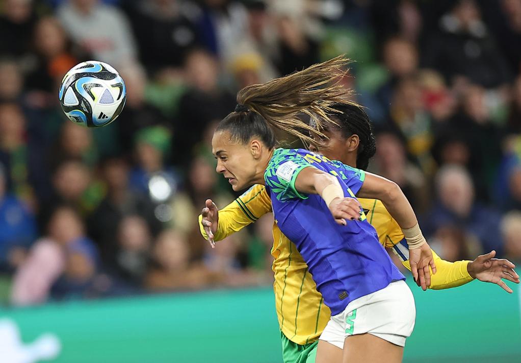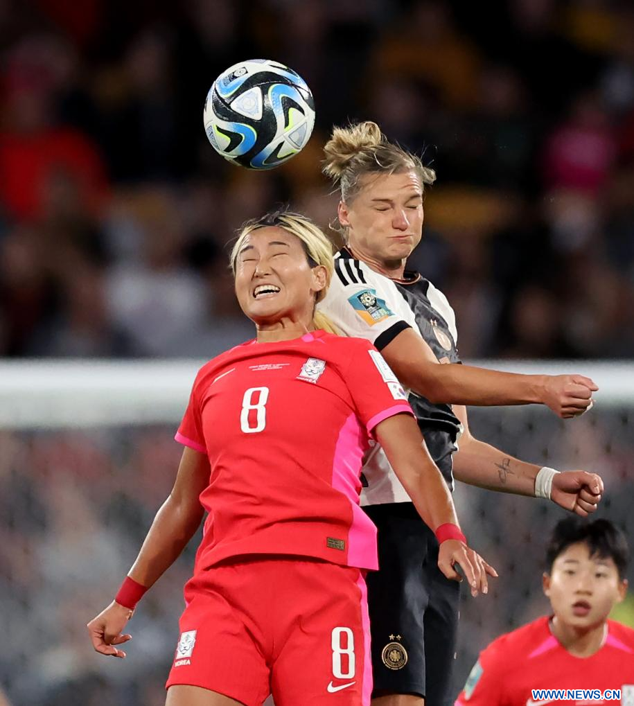 BRISBANE, 3 agosto, 2023 (Xinhua) -- Cho Sohyun (i), de República de Corea, compite por un cabezazo con Alexandra Popp, de Alemania, durante el partido del Grupo H entre República de Corea y Alemania en la Copa Mundial Femenina de la FIFA Australia y Nueva Zelanda 2023, en Brisbane, Australia, el 3 de agosto de 2023. (Xinhua/Zhang Chen)