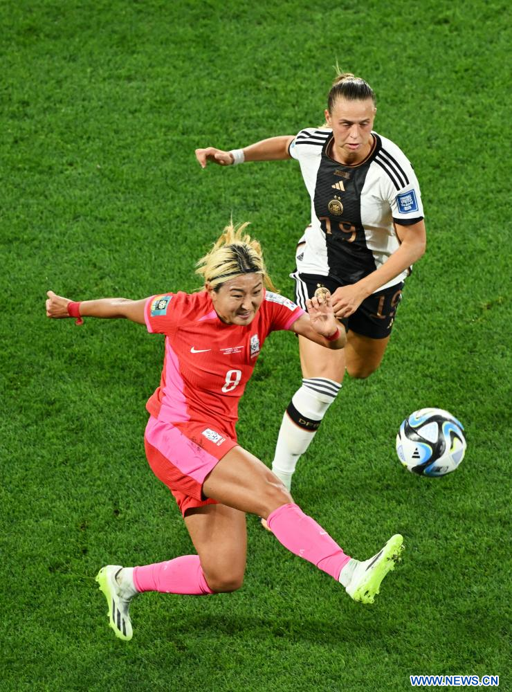 BRISBANE, 3 agosto, 2023 (Xinhua) -- Cho Sohyun (i), de República de Corea, compite durante el partido del Grupo H entre República de Corea y Alemania en la Copa Mundial Femenina de la FIFA Australia y Nueva Zelanda 2023, en Brisbane, Australia, el 3 de agosto de 2023. (Xinhua/Li Yibo)