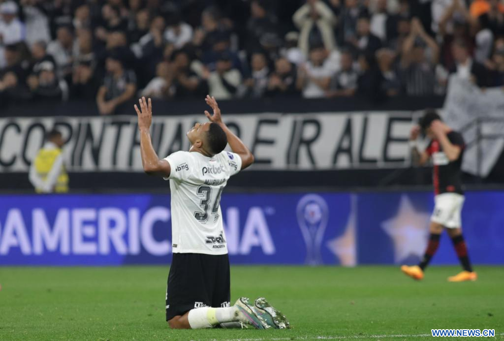 SAO PAULO, 2 agosto, 2023 (Xinhua) -- Imagen del 1 de agosto de 2023 del jugador Murillo (i), de Corinthians de Brasil, festejando al término del partido de ida de los octavos de final de la Copa Conmebol Sudamericana 2023 ante Newell's Old Boys de Argentina, celebrado en el Estadio Neo Química Arena, en Sao Paulo, Brasil. (Xinhua/Rahel Patrasso)