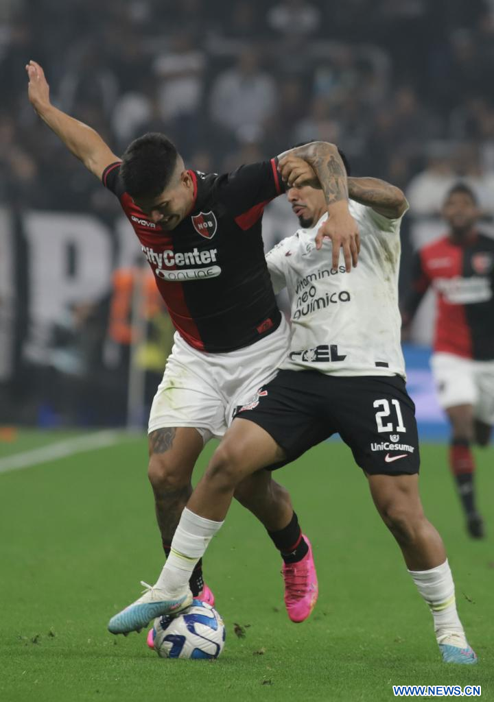 SAO PAULO, 2 agosto, 2023 (Xinhua) -- Imagen del 1 de agosto de 2023 del jugador Matheus Bidu (d), de Corinthians de Brasil, disputando el balón con Jorge Racalde (i), de Newell's Old Boys de Argentina, durante el partido de ida de los octavos de final de la Copa Conmebol Sudamericana 2023, celebrado en el Estadio Neo Química Arena, en Sao Paulo, Brasil. (Xinhua/Rahel Patrasso)