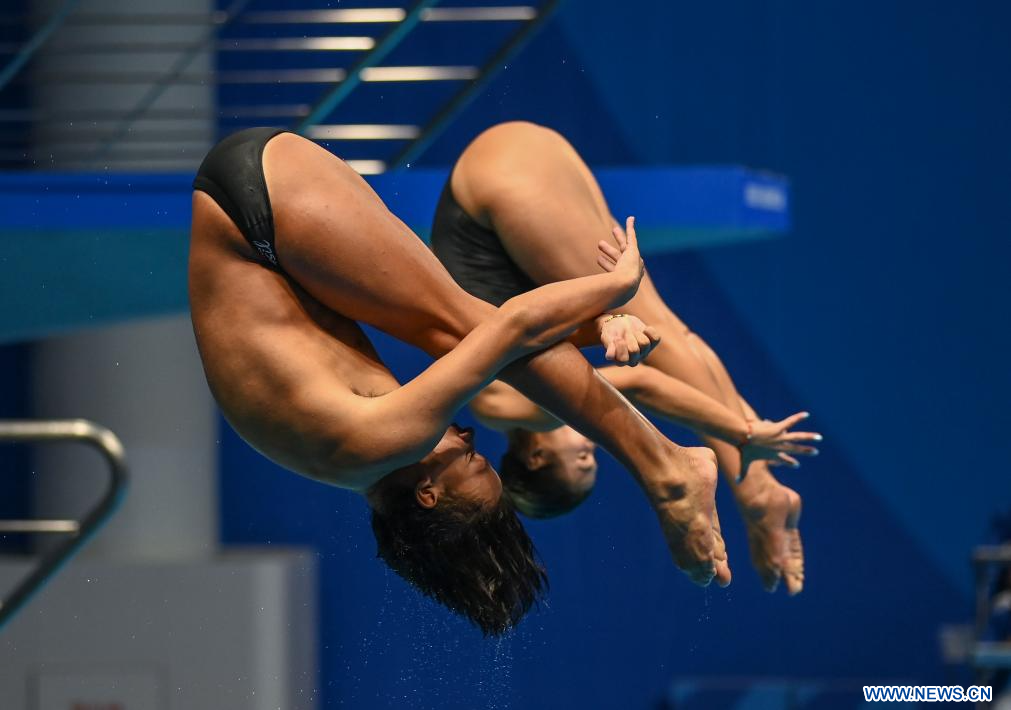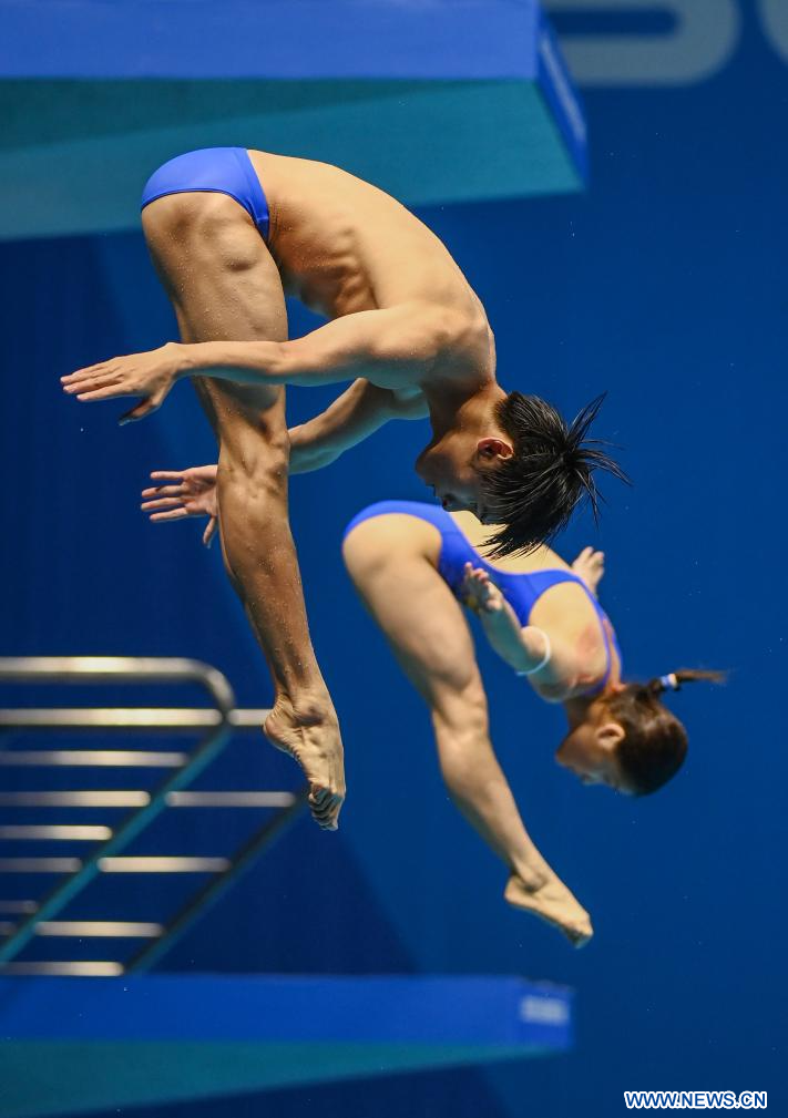 CHENGDU, 3 agosto, 2023 (Xinhua) -- Wang Weiying (atrás) y Yang Ling, de China, compiten durante la final mixta de trampolín de 3 metros sincronizado de clavados en la 31ª edición de verano de los Juegos Mundiales Universitarios de la FISU, en Chengdu, en la provincia de Sichuan, en el suroeste de China, el 3 de agosto de 2023. (Xinhua/Liu Kun)