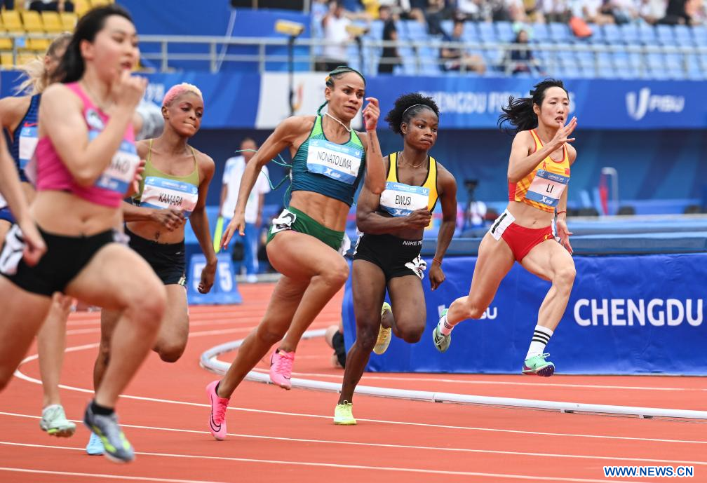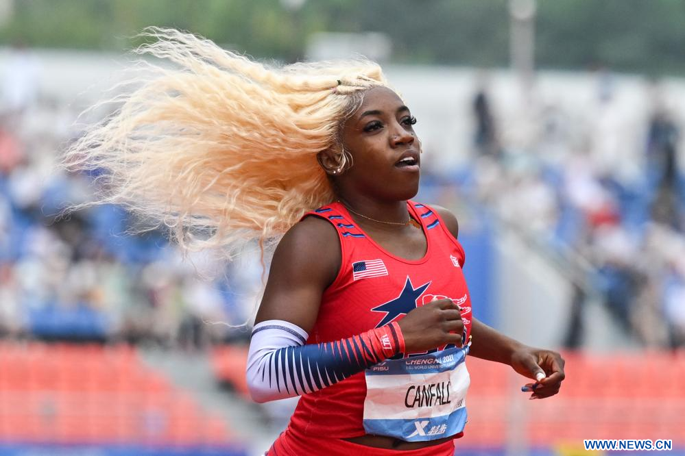 CHENGDU, 3 agosto, 2023 (Xinhua) -- Toni Lee Canfall, de Estados Unidos, compite durante las eliminatorias femeninas de la primera ronda de 200 metros de atletismo en la 31ª edición de verano de los Juegos Mundiales Universitarios de la FISU, en Chengdu, en la provincia de Sichuan, en el suroeste de China, el 3 de agosto de 2023. (Xinhua/Wang Xi)