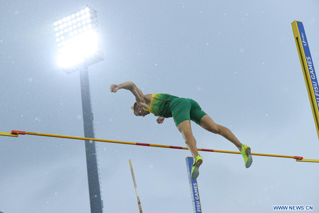 CHENGDU, 3 agosto, 2023 (Xinhua) -- Edgaras Benkunskas, de Lituania, compite durante la competencia masculina de salto con pértiga del decatlón de atletismo en la 31ª edición de verano de los Juegos Mundiales Universitarios de la FISU, en Chengdu, en la provincia de Sichuan, en el suroeste de China, el 3 de agosto de 2023. (Xinhua/Li Jing)