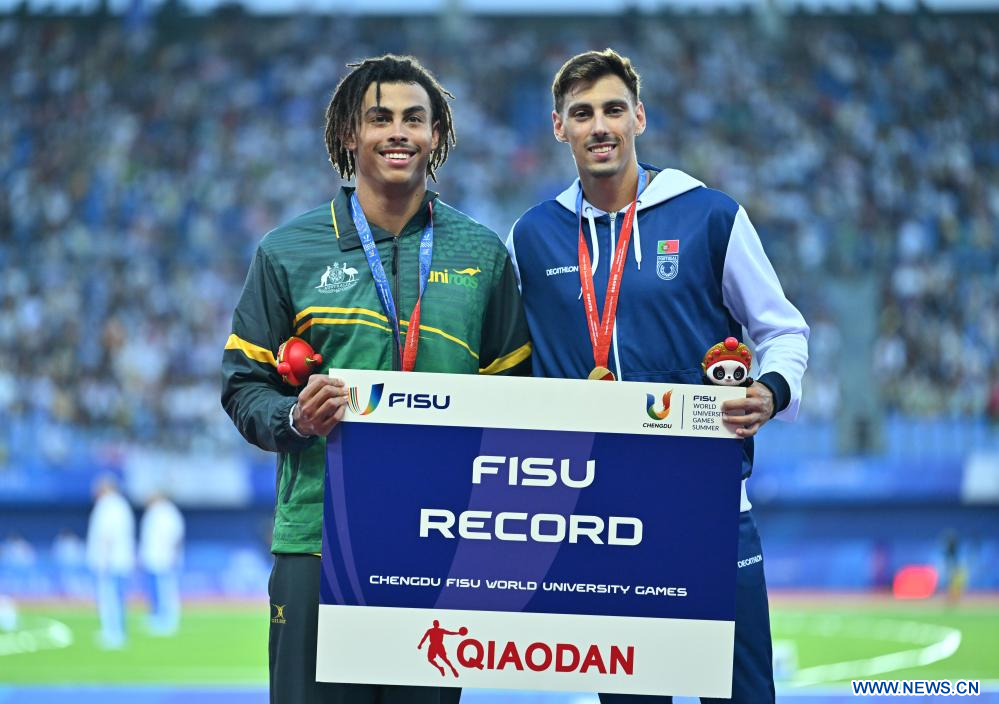 CHENGDU, 3 agosto, 2023 (Xinhua) -- El medallista de oro, Joao Ricardo Agostinho Coelho (d), de Portugal y el medallista de plata, Reece Nathaniel Holder, de Australia, posan en el podio durante la ceremonia de premiación de la final masculina de 400m de atletismo en la 31ª edición de verano de los Juegos Mundiales Universitarios de la FISU, en Chengdu, en la provincia de Sichuan, en el suroeste de China, el 3 de agosto de 2023. (Xinhua/Cai Xiangxin)