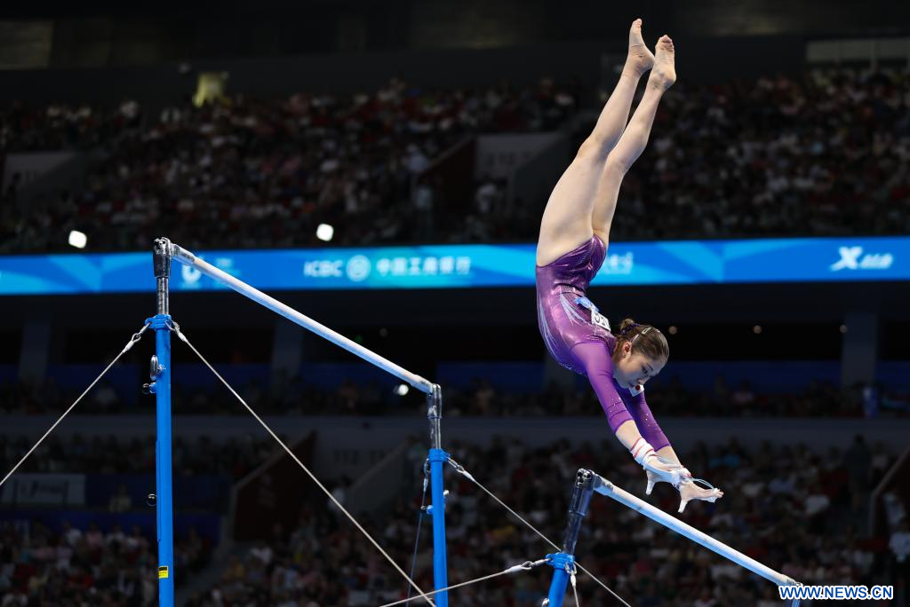 CHENGDU, 3 agosto, 2023 (Xinhua) -- Fukasawa Kokoro, de Japón, compite en el evento de barras asimétricas de la final femenina por equipos de gimnasia artística y competencia de la subdivisión 3 de calificación individual en la 31ª edición de verano de los Juegos Mundiales Universitarios de la FISU, en Chengdu, en la provincia de Sichuan, en el suroeste de China, 3 de agosto de 2023. (Xinhua/Wang Jingqiang)