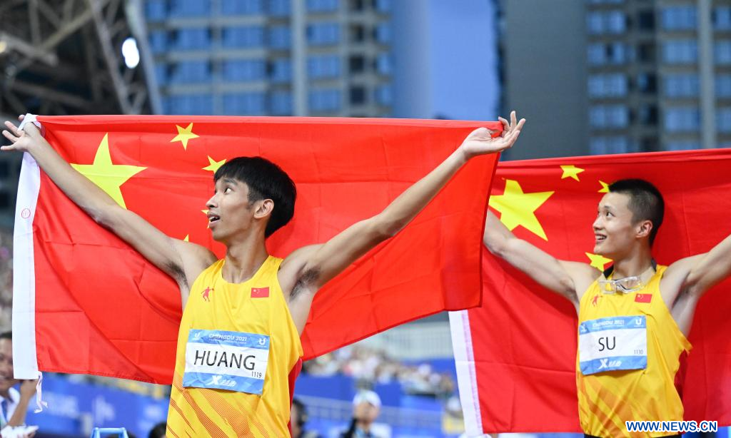 CHENGDU, 3 agosto, 2023 (Xinhua) -- El medallista de bronce, Huang Huafeng (i), de China, y el medallista de oro, Su Wen, de China, festejan al término de la final masculina de salto triple de atletismo en la 31ª edición de verano de los Juegos Mundiales Universitarios de la FISU, en Chengdu, en la provincia de Sichuan, en el suroeste de China, el 3 de agosto de 2023. (Xinhua/Deng Hua)