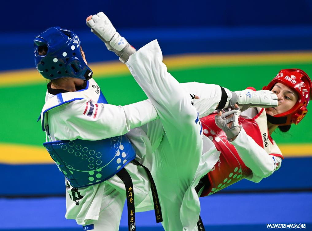 CHENGDU, 2 agosto, 2023 (Xinhua) -- Sasikarn Tongchan (c) compite durante la final de taekwondo femenino de -62kg entre Sasikarn Tongchan, de Tailandia, y Feruza Sadikova, de Uzbekistán, en la 31ª edición de verano de los Juegos Mundiales Universitarios de la FISU, en Chengdu, en la provincia de Sichuan, en el suroeste de China, el 2 de agosto de 2023. (Xinhua/Jiang Hongjing)