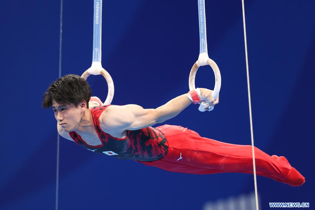 CHENGDU, 2 agosto, 2023 (Xinhua) -- Hashimoto Daiki, de Japón, compite en el evento de Anillos de la Final por Equipos de Gimnasia Artística Masculina y competencia de la Subdivisión 4 de Calificación Individual en la 31ª edición de verano de los Juegos Mundiales Universitarios de la FISU, en Chengdu, en la provincia de Sichuan, en el suroeste de China, el 2 de agosto de 2023. (Xinhua/Zhang Liyun)