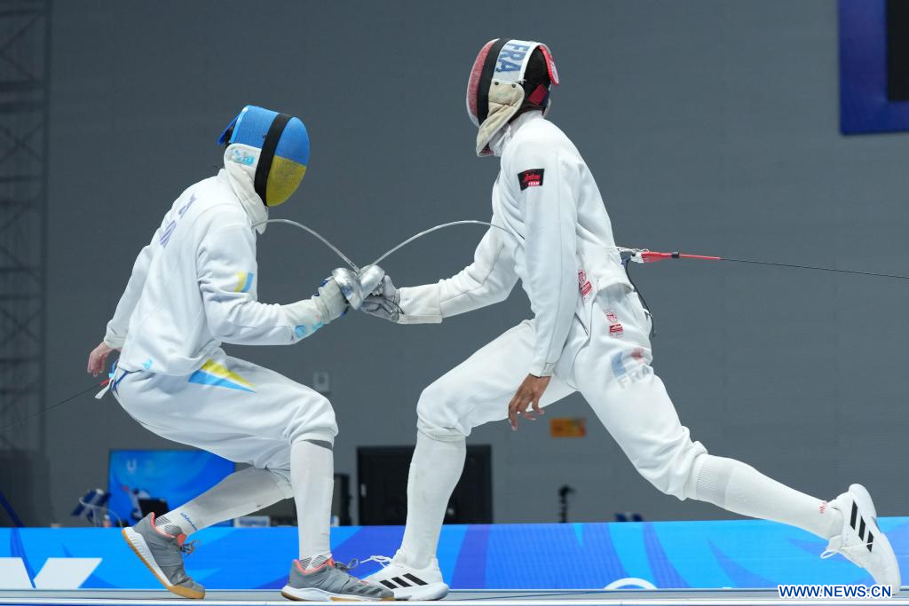 CHENGDU, 3 agosto, 2023 (Xinhua) -- Kendrick Jean-Joseph (d), de Francia, compite ante Yan Sych (i), de Ucrania, durante el combate por la medalla de oro de espada individual masculina de esgrima en la 31ª edición de verano de los Juegos Mundiales Universitarios de la FISU, en Chengdu, en la provincia de Sichuan, en el suroeste de China, el 3 de agosto de 2023. (Xinhua/Luo Xuefeng)