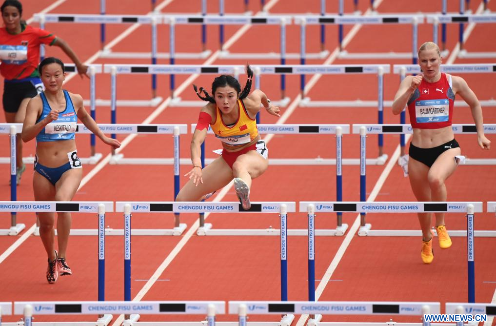 CHENGDU, 3 agosto, 2023 (Xinhua) -- (De izq. a der.) Saara Fu Sofia Keskitalo, de Finlandia, Wu Yanni, de China, y Meret Annabelle Baumgartner, de Suiza, compiten durante las eliminatorias femeninas de la primera ronda de 100 metros con vallas de atletismo en la 31ª edición de verano de los Juegos Mundiales Universitarios de la FISU, en Chengdu, en la provincia de Sichuan, en el suroeste de China, el 3 de agosto de 2023. (Xinhua/Cai Xiangxin)