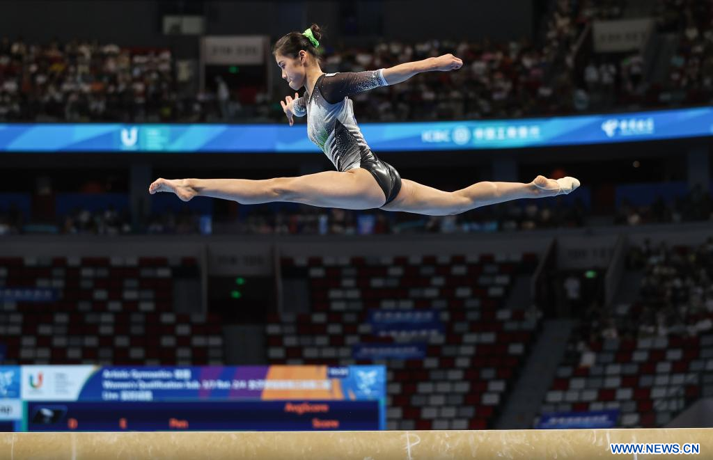 CHENGDU, 3 agosto, 2023 (Xinhua) -- Ou Yushan, de China, compite en el evento de barra de equilibrio de la final femenina por equipos de gimnasia artística y en la competencia de la subdivisión 2 de calificación individual en la 31ª edición de verano de los Juegos Mundiales Universitarios de la FISU, en Chengdu, en la provincia de Sichuan, en el suroeste de China, el 3 de agosto de 2023. (Xinhua/Wang Jingqiang)