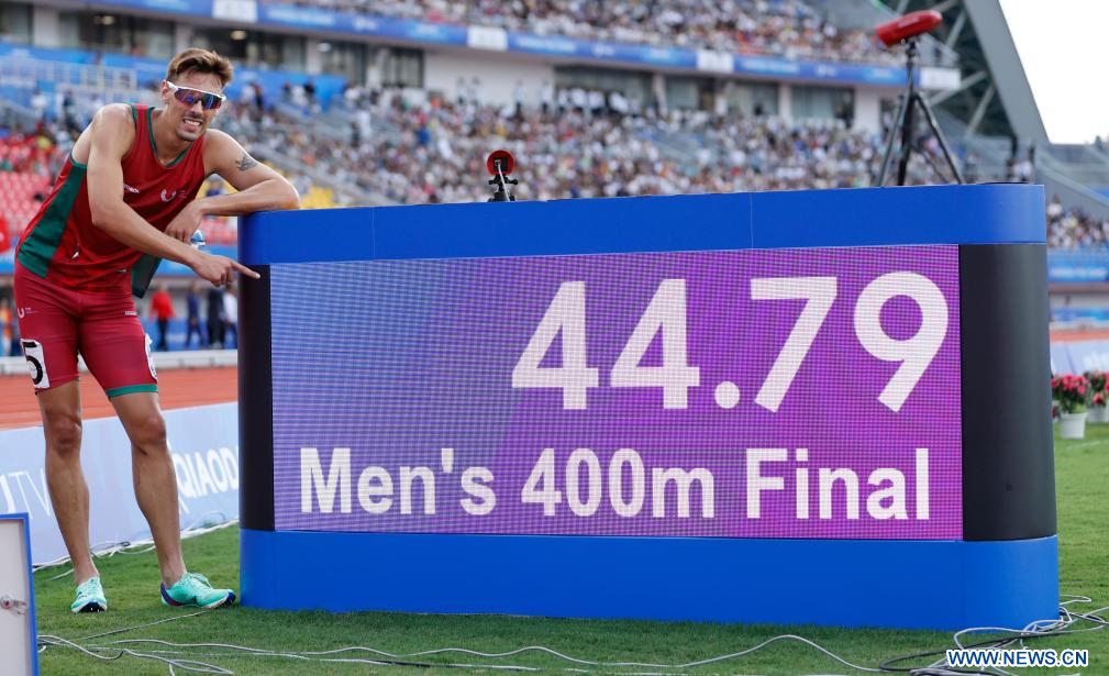 CHENGDU, 3 agosto, 2023 (Xinhua) -- El medallista de oro, Joao Ricardo Agostinho Coelho, de Portugal, se toma fotografías con el récord de la FISU en la tabla de tiempos al término de la final masculina de 400m de atletismo en la 31ª edición de verano de los Juegos Mundiales Universitarios de la FISU, en Chengdu, en la provincia de Sichuan, en el suroeste de China, el 3 de agosto de 2023. (Xinhua/Jia Haocheng)