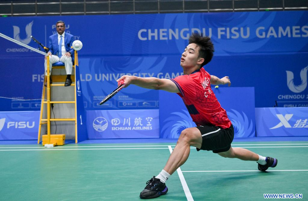 CHENGDU, 2 agosto, 2023 (Xinhua) -- Wang Zhengxing, de China, compite durante el partido indivudual masculino ante Saran Jamsri, de Tailandia, en el partido de Semifinal de Equipos Mixtos de Bádminton entre el equipo de China y el equipo de Tailandia en la 31ª edición de verano de los Juegos Mundiales Universitarios de la FISU, en Chengdu, en la provincia de Sichuan, en el suroeste de China, el 2 de agosto de 2023. (Xinhua/Jigme Dorji)