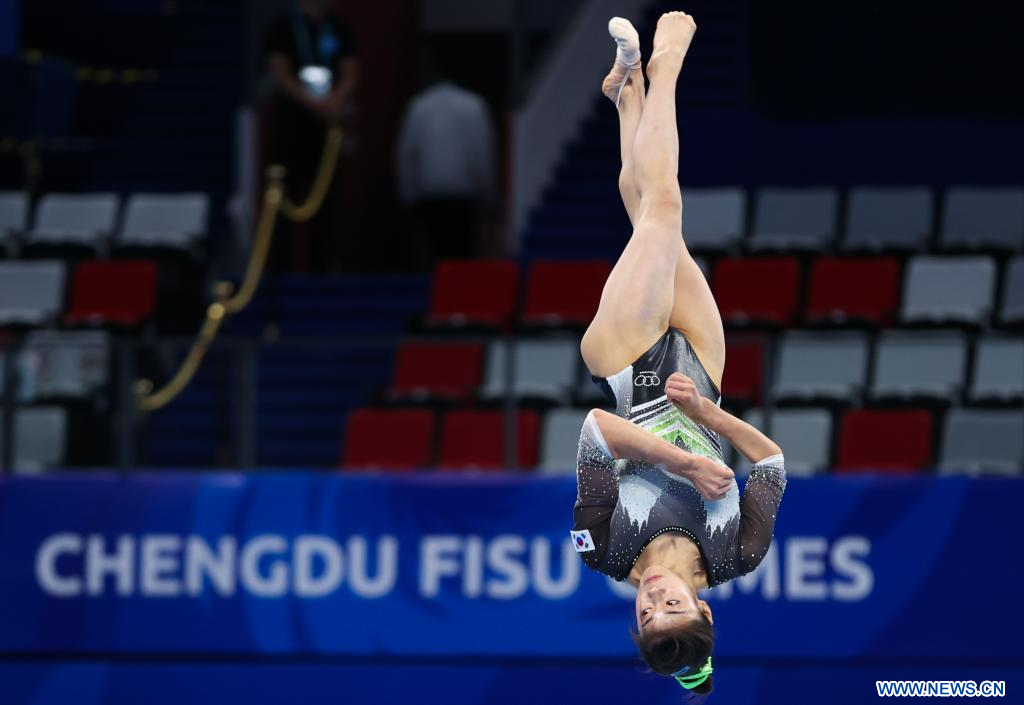 CHENGDU, 3 agosto, 2023 (Xinhua) -- Lee Dayeong, de República de Corea, compite en el evento de barra de equilibrio de la final femenina por equipos de gimnasia artística y calificación individual de la subdivisión 3 en la 31ª edición de verano de los Juegos Mundiales Universitarios de la FISU, en Chengdu, en la provincia de Sichuan, en el suroeste de China, el 3 de agosto de 2023. (Xinhua/Zhang Liyun)