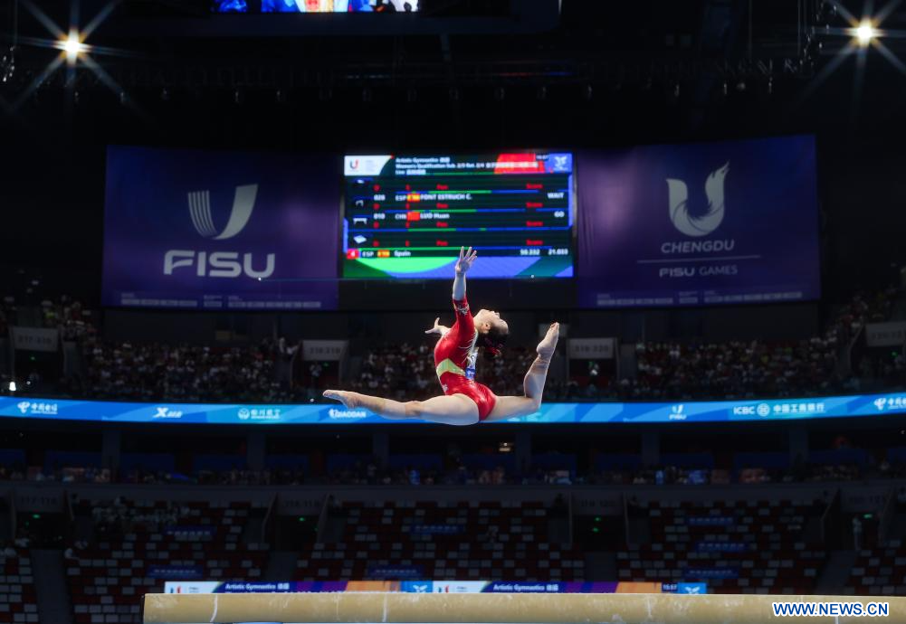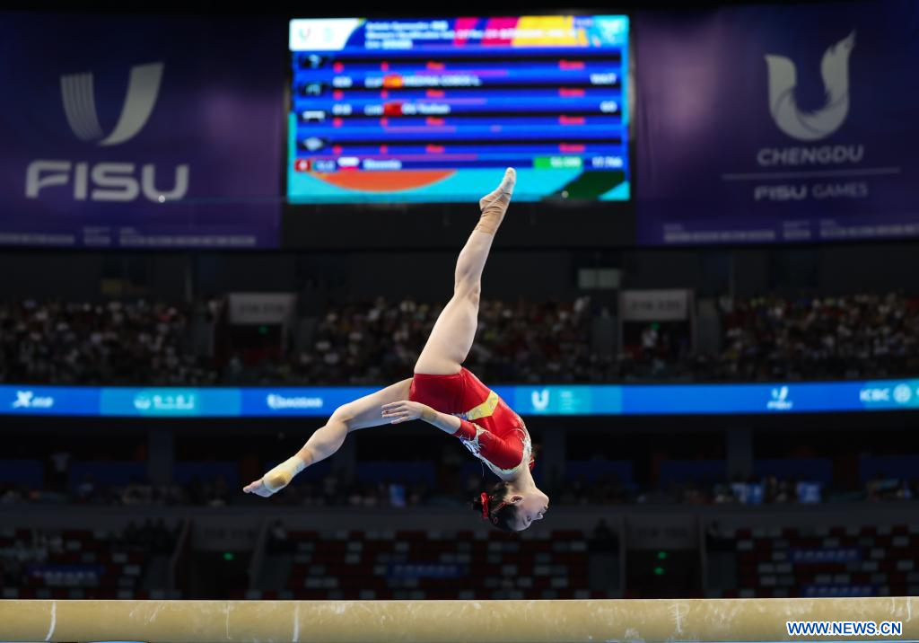 CHENGDU, 3 agosto, 2023 (Xinhua) -- Luo Huan, de China, compite en el evento de barra de equilibrio de la final femenina por equipos de gimnasia artística y en la competencia de la subdivisión 2 de calificación individual en la 31ª edición de verano de los Juegos Mundiales Universitarios de la FISU, en Chengdu, en la provincia de Sichuan, en el suroeste de China, el 3 de agosto de 2023. (Xinhua/Wang Jingqiang)