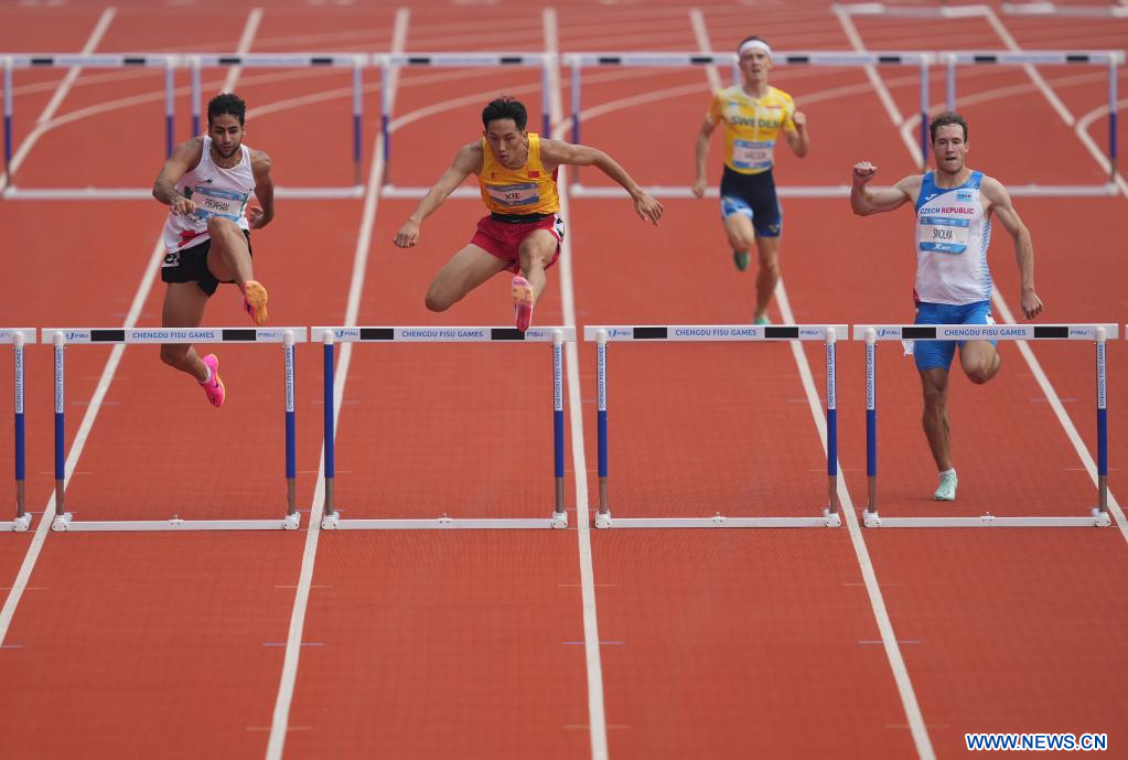 CHENGDU, 2 agosto, 2023 (Xinhua) -- Xie Zhiyu (2-i), de China, compite durante las Eliminatorias de la primera Ronda de 400m con Vallas Masculinos de Atletismo en la 31ª edición de verano de los Juegos Mundiales Universitarios de la FISU, en Chengdu, en la provincia de Sichuan, en el suroeste de China, el 2 de agosto de 2023. (Xinhua/Li Jing)