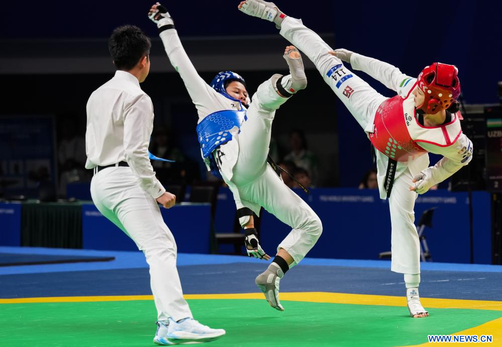 CHENGDU, 2 agosto, 2023 (Xinhua) -- Feruza Sadikova (d) compite durante la final de taekwondo femenino de -62kg entre Sasikarn Tongchan, de Tailandia, y Feruza Sadikova, de Uzbekistán, en la 31ª edición de verano de los Juegos Mundiales Universitarios de la FISU, en Chengdu, en la provincia de Sichuan, en el suroeste de China, el 2 de agosto de 2023. (Xinhua/Liu Lei)