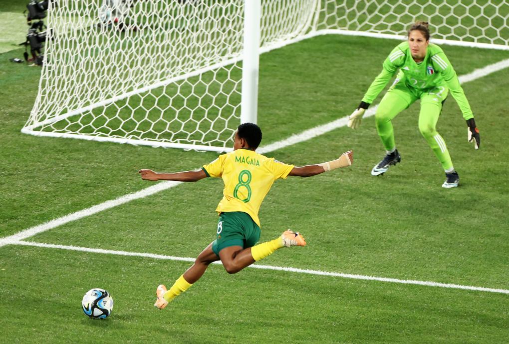 WELLINGTON, 2 agosto, 2023 (Xinhua) -- Hildah Magaia (i), de Sudáfrica, dispara durante el partido del Grupo G entre Sudáfrica e Italia en la Copa Mundial Femenina de la FIFA Australia y Nueva Zelanda 2023, en Wellington, Nueva Zelanda, el 2 de agosto de 2023. (Xinhua/Qin Lang)