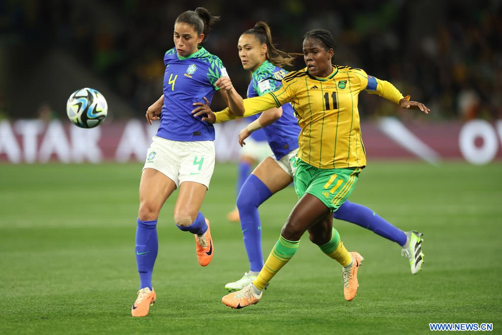 MELBOURNE, 2 agosto, 2023 (Xinhua) -- Kathellen (frente), de Brasil, compite por un cabezazo durante el partido del Grupo F entre Jamaica y Brasil en la Copa Mundial Femenina de la FIFA Australia y Nueva Zelanda 2023, en Melbourne, Australia, el 2 de agosto de 2023. (Xinhua/Ding Xu)