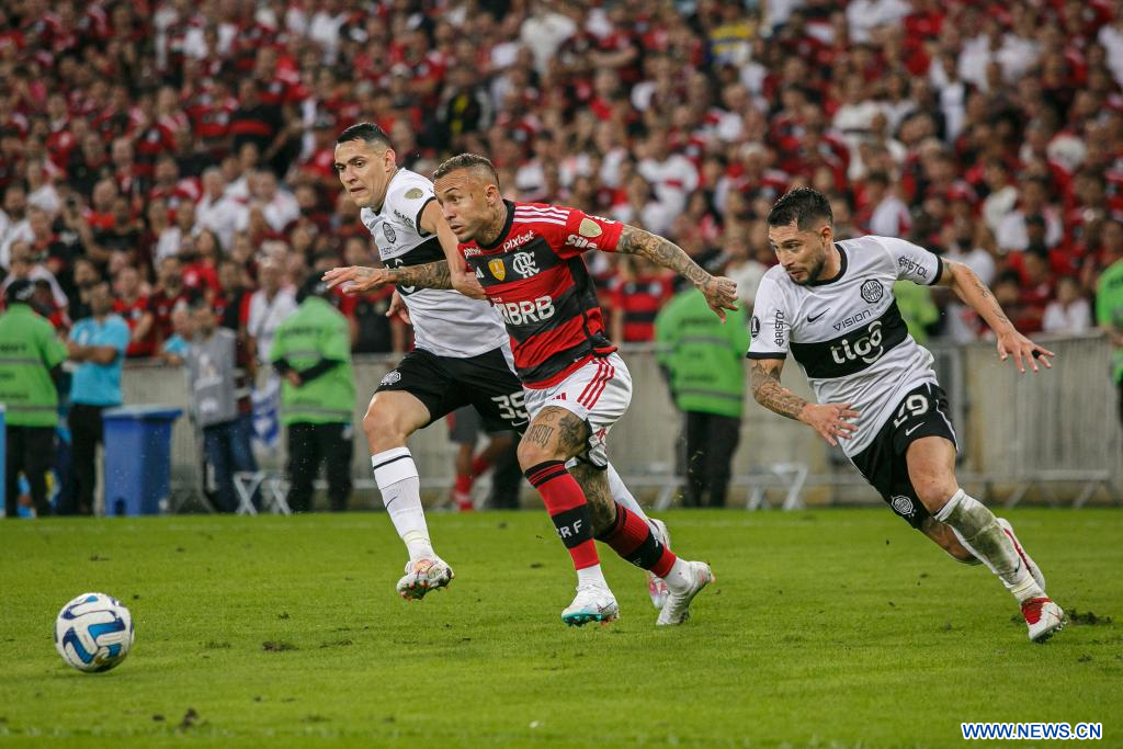 RIO DE JANEIRO, 4 agosto, 2023 (Xinhua) -- Imagen del 3 de agosto de 2023 del jugador Everton (c), de Flamengo de Brasil, disputando el balón con Diego Torres (i) y Víctor Salazar (d), de Olimpia de Paraguay, durante el partido de ida correspondiente a los octavos de final de la Copa Libertadores de América, celebrado en el Estadio Maracaná, en Río de Janeiro, Brasil. (Xinhua/Claudia Martini)