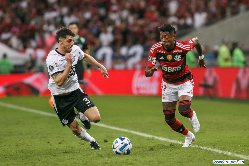RIO DE JANEIRO, 4 agosto, 2023 (Xinhua) -- Imagen del 3 de agosto de 2023 del jugador Bruno Henrique (d), de Flamengo de Brasil, disputando el balón con Alejandro Silva (i), de Olimpia de Paraguay, durante el partido de ida correspondiente a los octavos de final de la Copa Libertadores de América, celebrado en el Estadio Maracaná, en Río de Janeiro, Brasil. (Xinhua/Claudia Martini)