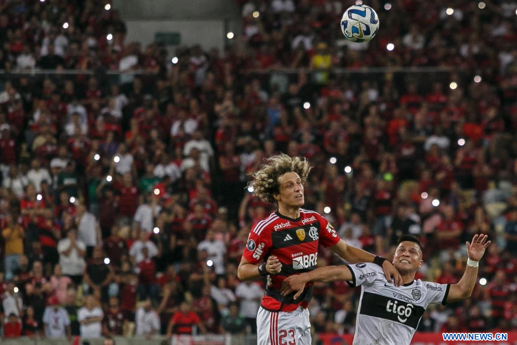 RIO DE JANEIRO, 4 agosto, 2023 (Xinhua) -- Imagen del 3 de agosto de 2023 del jugador David Luiz (i), de Flamengo de Brasil, disputando el balón con Hugo Quintana (d), de Olimpia de Paraguay, durante el partido de ida correspondiente a los octavos de final de la Copa Libertadores de América, celebrado en el Estadio Maracaná, en Río de Janeiro, Brasil. (Xinhua/Claudia Martini)