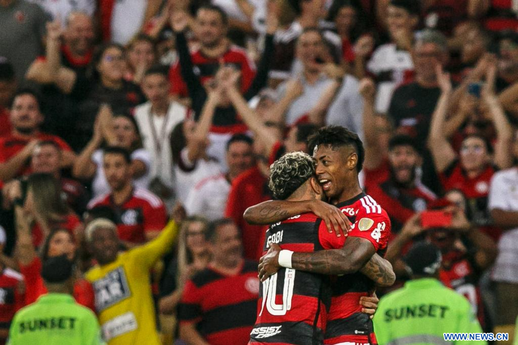 RIO DE JANEIRO, 4 agosto, 2023 (Xinhua) -- Imagen del 3 de agosto de 2023 del jugador Bruno Henrique (d), de Flamengo de Brasil, festejando una anotación con su compañero Gabi (i) durante el partido de ida ante Olimpia de Paraguay correspondiente a los octavos de final de la Copa Libertadores de América, celebrado en el Estadio Maracaná, en Río de Janeiro, Brasil. (Xinhua/Claudia Martini)