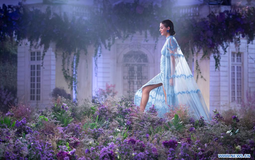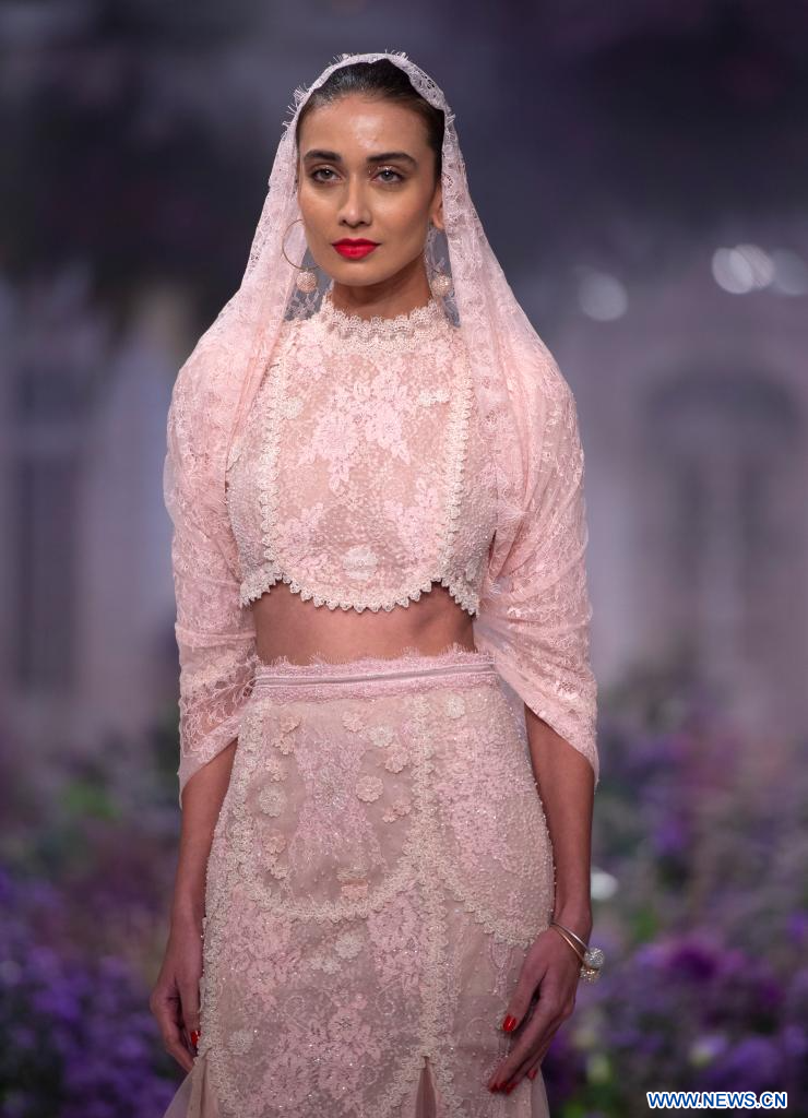 NUEVA DELHI, 2 agosto, 2023 (Xinhua) -- Imagen del 1 de agosto de 2023 de una modelo presentando una creación de la diseñadora india Isha J durante la Semana de Alta Costura de India FDCI 2023, en Nueva Delhi, India. (Xinhua/Javed Dar)