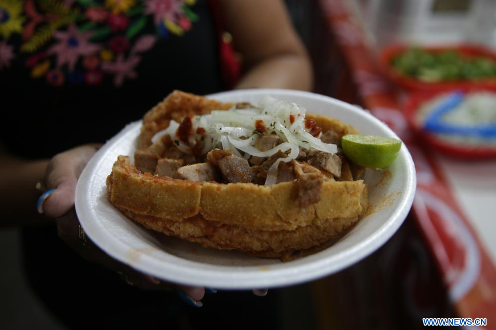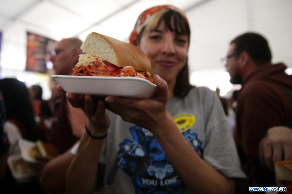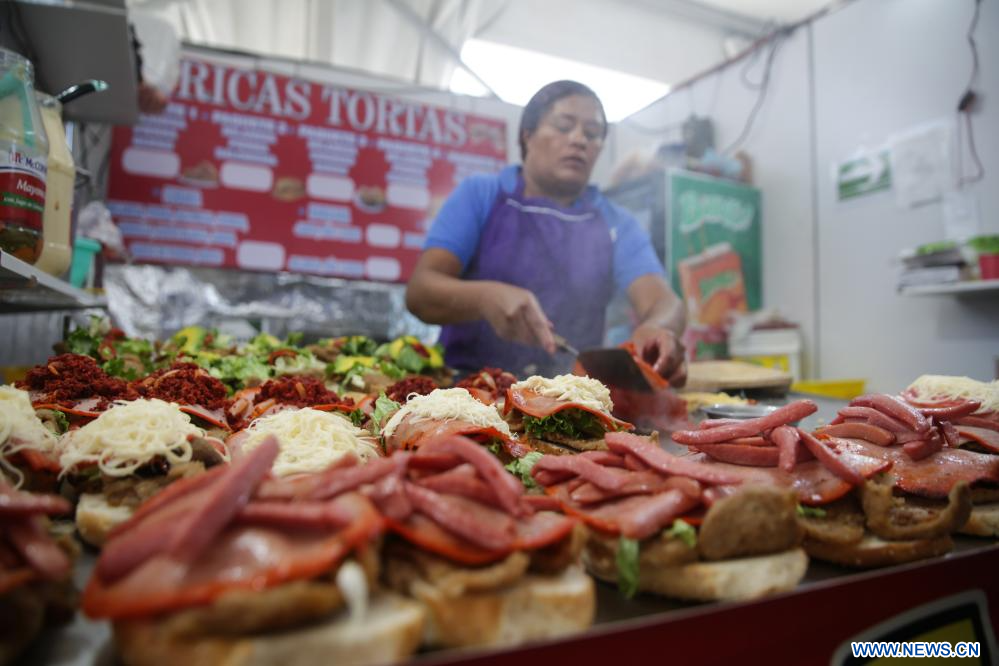 CIUDAD DE MEXICO, 3 agosto, 2023 (Xinhua) -- Imagen del 2 de agosto de 2023 de una mujer mostrando una torta durante la 18 Feria de la Torta que se realiza anualmente, en la Ciudad de México, capital de México. La "torta" es conocida como un sándwich tradicional en México y es bien recibida por las personas locales. (Xinhua/Francisco Cañedo)