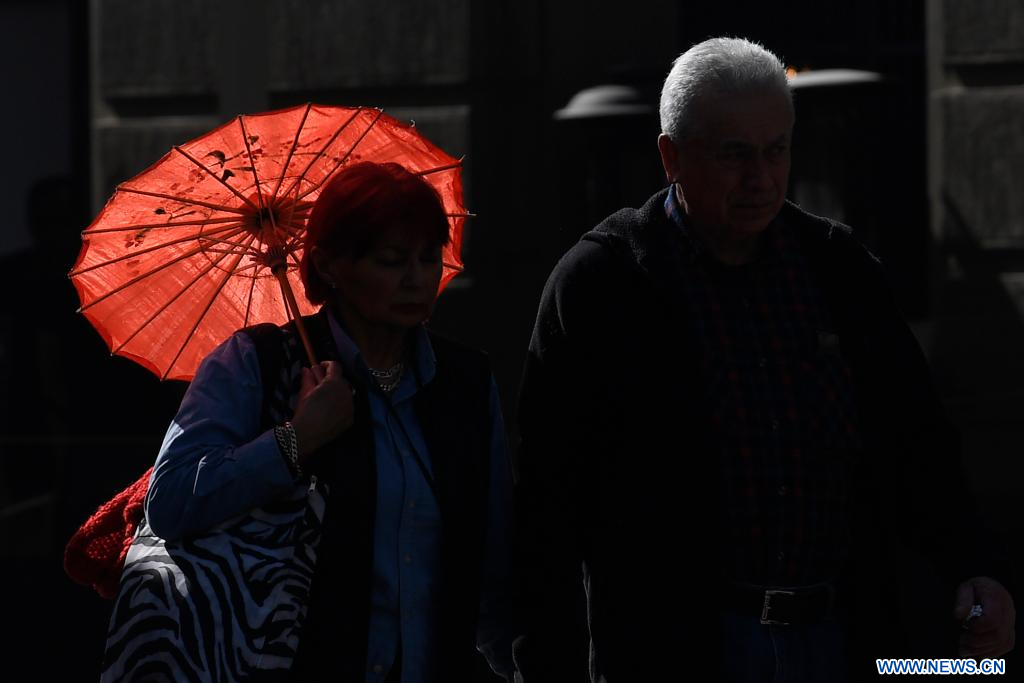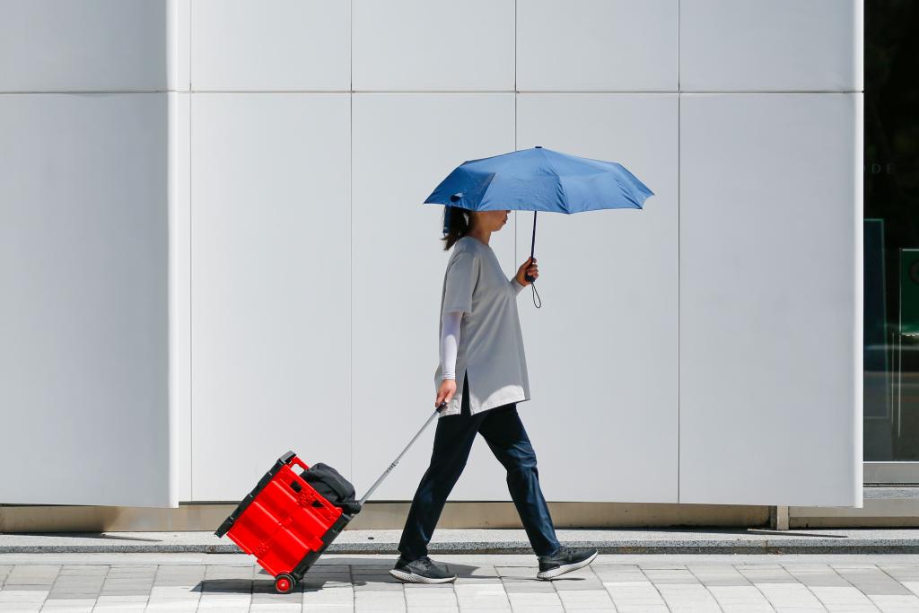 SANTIAGO, 4 agosto, 2023 (Xinhua) -- Una mujer se protege del sol con una sombrilla durante una ola de calor, en Santiago, capital de Chile, el 4 de agosto de 2023. (Xinhua/Jorge Villegas)