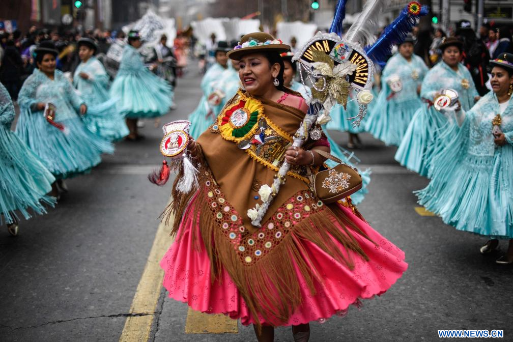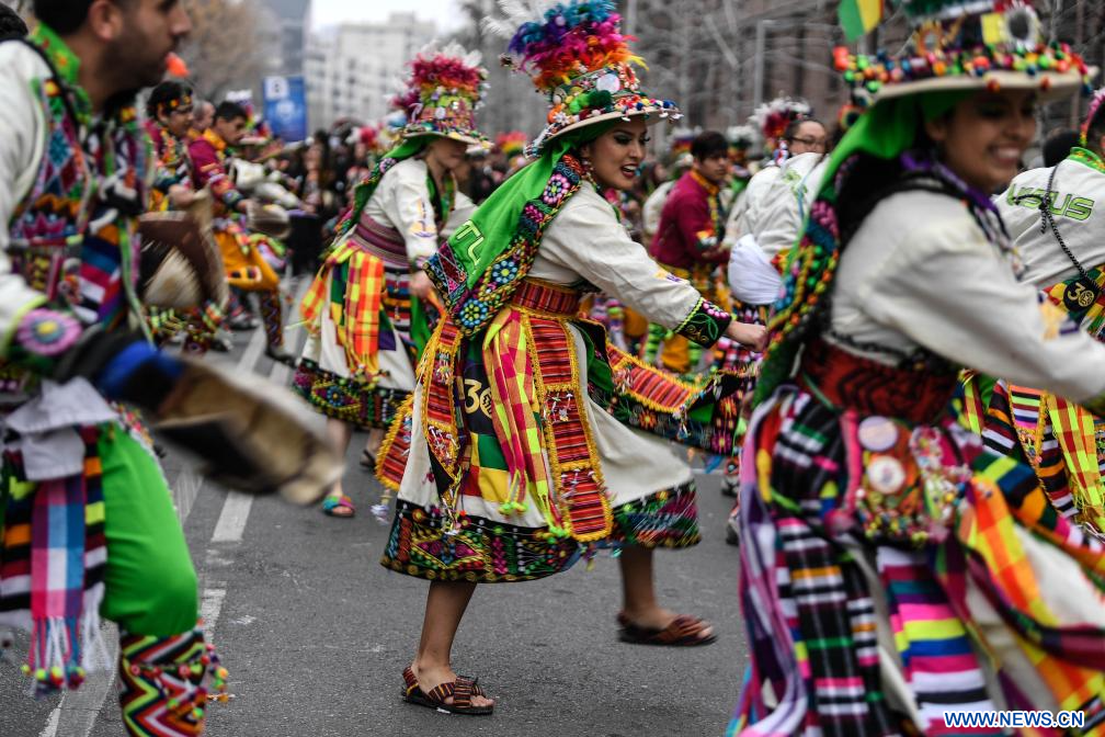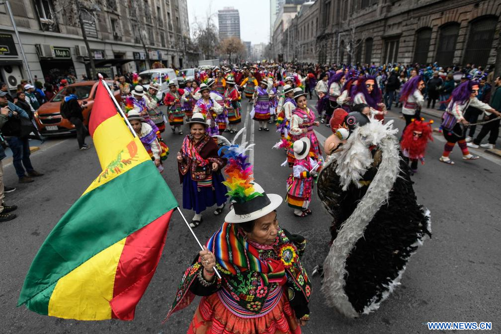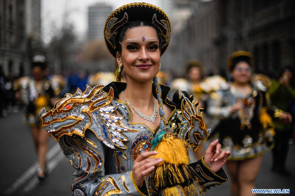 SANTIAGO, 5 agosto, 2023 (Xinhua) -- Bolivianos residentes en Chile interpretan un baile típico durante la XIX Gran Entrada Folklórica por el Día de Bolivia, en Santiago, capital de Chile, el 5 de agosto de 2023. (Xinhua/Jorge Villegas)