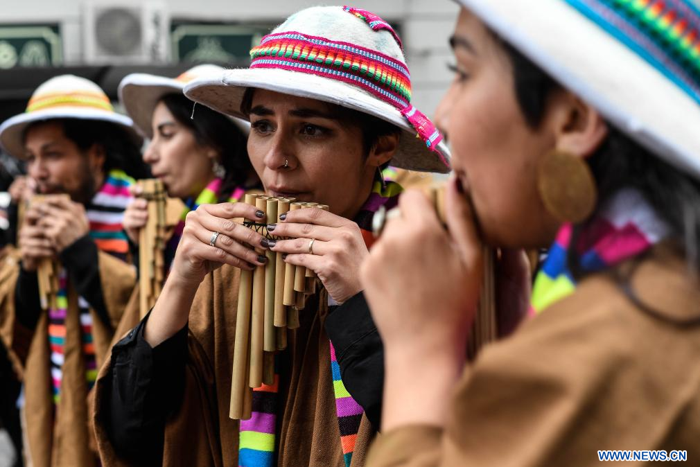 SANTIAGO, 5 agosto, 2023 (Xinhua) -- Bolivianos residentes en Chile interpretan música típica durante la XIX Gran Entrada Folklórica por el Día de Bolivia, en Santiago, capital de Chile, el 5 de agosto de 2023. (Xinhua/Jorge Villegas)