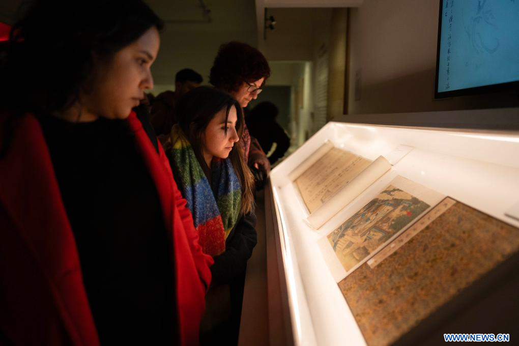 BUENOS AIRES, 5 agosto, 2023 (Xinhua) -- Imagen del 4 de agosto de 2023 de personas observando obras de pintura china durante la conferencia "El movimiento de lo inmóvil: formatos y técnicas narrativas en la pintura china", en el Museo Nacional de Arte Oriental (MNAO), en la ciudad de Buenos Aires, capital de Argentina. Los formatos y las técnicas narrativas en la pintura china se convirtieron el viernes en el eje de una atractiva presentación en el MNAO, establecimiento cultural en el que se dieron cita personas interesadas en la milenaria cultura del país asiático. (Xinhua/Martín Zabala)
