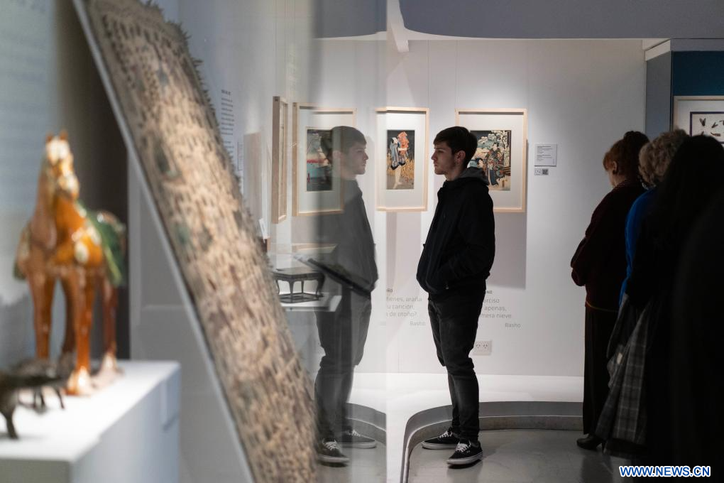 BUENOS AIRES, 5 agosto, 2023 (Xinhua) -- Imagen del 4 de agosto de 2023 de un hombre observando obras exhibidas durante la conferencia "El movimiento de lo inmóvil: formatos y técnicas narrativas en la pintura china", en el Museo Nacional de Arte Oriental (MNAO), en la ciudad de Buenos Aires, capital de Argentina. Los formatos y las técnicas narrativas en la pintura china se convirtieron el viernes en el eje de una atractiva presentación en el MNAO, establecimiento cultural en el que se dieron cita personas interesadas en la milenaria cultura del país asiático. (Xinhua/Martín Zabala)