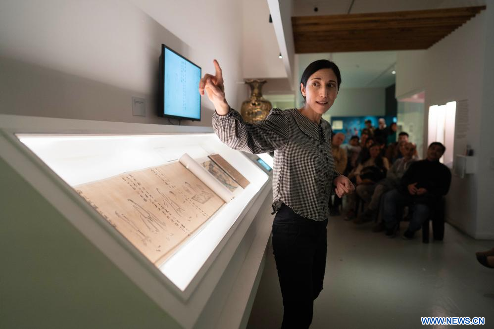 BUENOS AIRES, 5 agosto, 2023 (Xinhua) -- Imagen del 4 de agosto de 2023 de la experta Verónica Flores hablando durante la conferencia "El movimiento de lo inmóvil: formatos y técnicas narrativas en la pintura china", en el Museo Nacional de Arte Oriental (MNAO), en la ciudad de Buenos Aires, capital de Argentina. Los formatos y las técnicas narrativas en la pintura china se convirtieron el viernes en el eje de una atractiva presentación en el MNAO, establecimiento cultural en el que se dieron cita personas interesadas en la milenaria cultura del país asiático. (Xinhua/Martín Zabala)