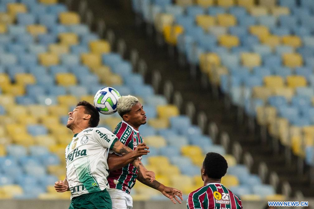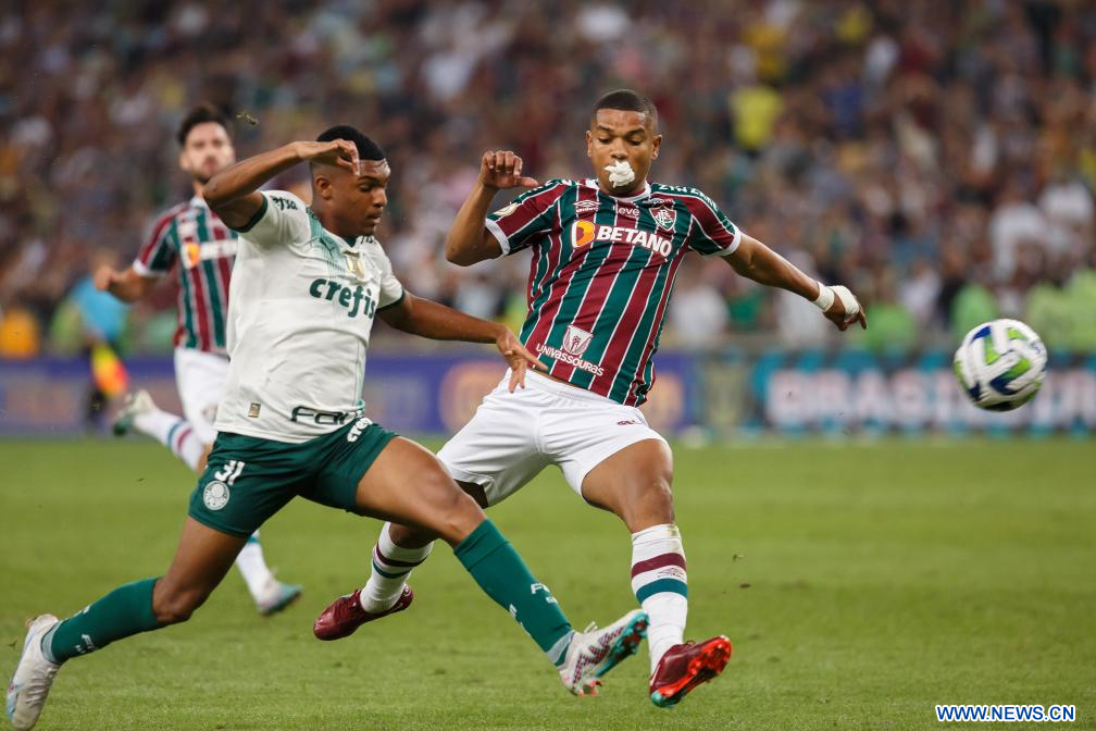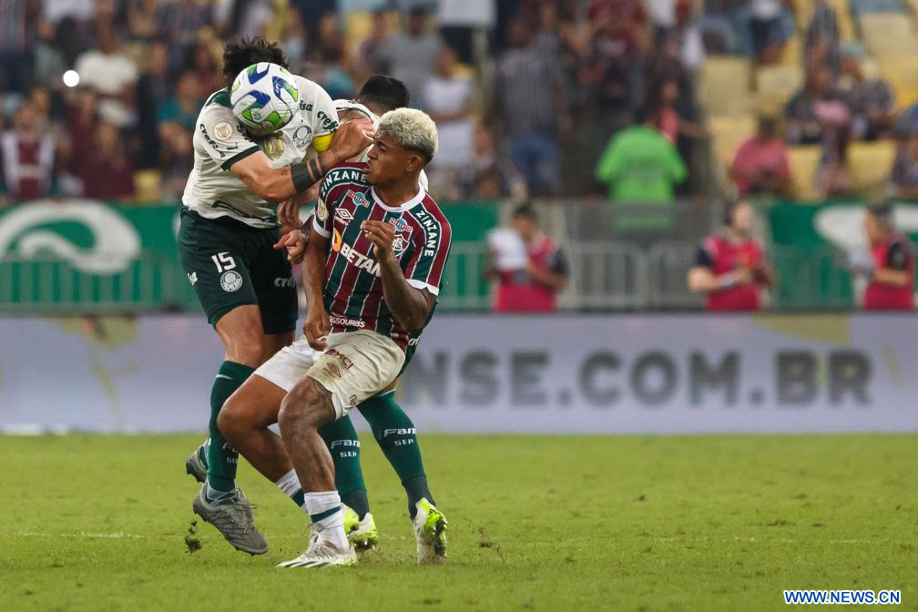 RIO DE JANEIRO, 6 agosto, 2023 (Xinhua) -- Imagen del 5 de agosto de 2023 del jugador John Kennedy (d), de Fluminense, disputando el balón con Richard Ríos (i), de Palmeiras, durante el partido correspondiente al Campeonato Brasileño 2023-Serie A, celebrado en el Estadio Maracaná, en Río de Janeiro, Brasil. (Xinhua/Claudia Martini)