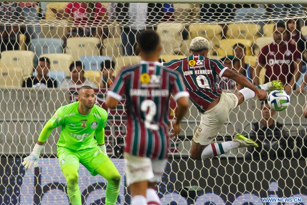 RIO DE JANEIRO, 6 agosto, 2023 (Xinhua) -- Imagen del 5 de agosto de 2023 del jugador John Kennedy (d), de Fluminense, realizando una anotación durante el partido correspondiente al Campeonato Brasileño 2023-Serie A ante Palmeiras, celebrado en el Estadio Maracaná, en Río de Janeiro, Brasil. (Xinhua/Claudia Martini)