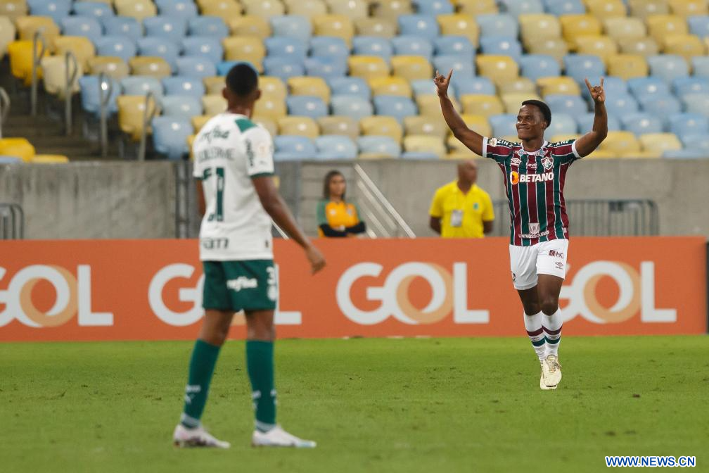 RIO DE JANEIRO, 6 agosto, 2023 (Xinhua) -- Imagen del 5 de agosto de 2023 del jugador Jhon Arias (d), de Fluminense, festejando su anotación durante el partido correspondiente al Campeonato Brasileño 2023-Serie A ante Palmeiras, celebrado en el Estadio Maracaná, en Río de Janeiro, Brasil. (Xinhua/Claudia Martini)
