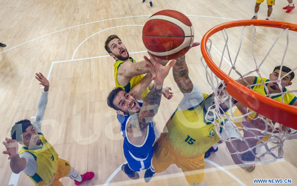 CHENGDU, 6 agosto, 2023 (Xinhua) -- Nikolaos Noumeros (c-abajo), de República Checa, compite por un rebote durante el partido por la medalla de oro de baloncesto masculino entre República Checa y Brasil en la 31ª edición de verano de los Juegos Mundiales Universitarios de la FISU, en Chengdu, en la provincia de Sichuan, en el suroeste de China, el 6 de agosto de 2023. (Xinhua/Hu Chao)
