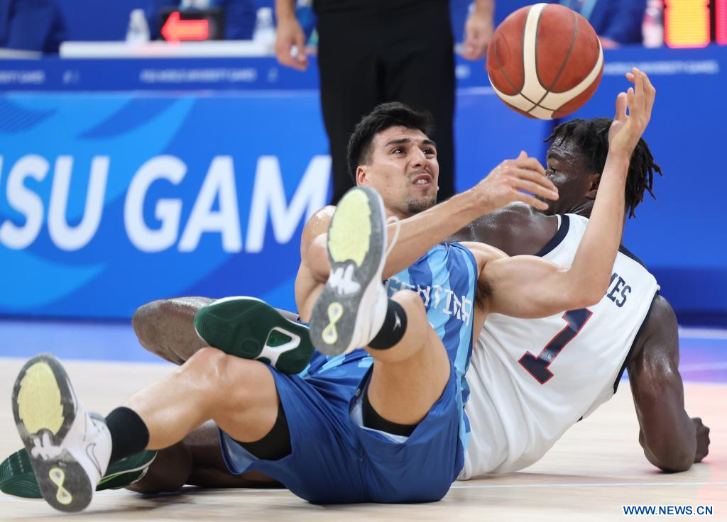CHENGDU, 6 agosto, 2023 (Xinhua) -- Facundo Corvalan (i), de Argentina, disputa el balón con Sion James, de Estados Unidos, durante el partido por la medalla de bronce de baloncesto masculino entre Estados Unidos y Argentina en la 31ª edición de verano de los Juegos Mundiales Universitarios de la FISU, en Chengdu, en la provincia de Sichuan, en el suroeste de China, el 6 de agosto de 2023. (Xinhua/Yang Qing)