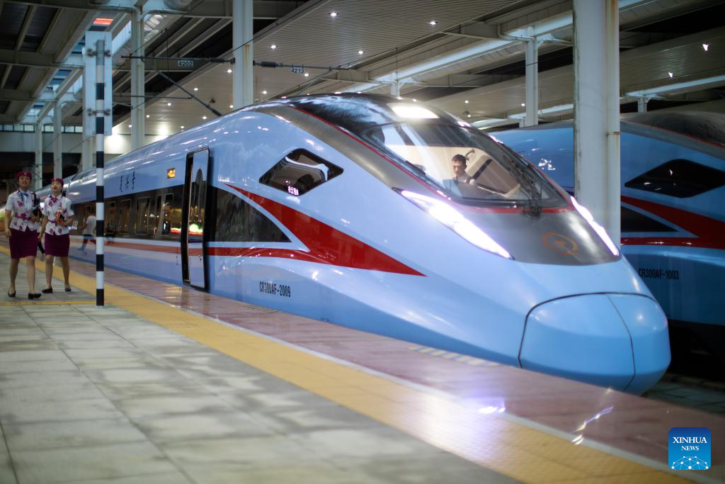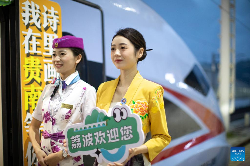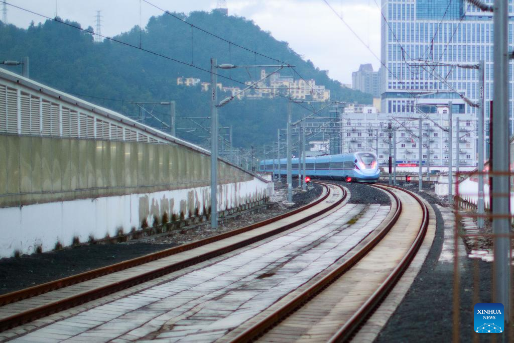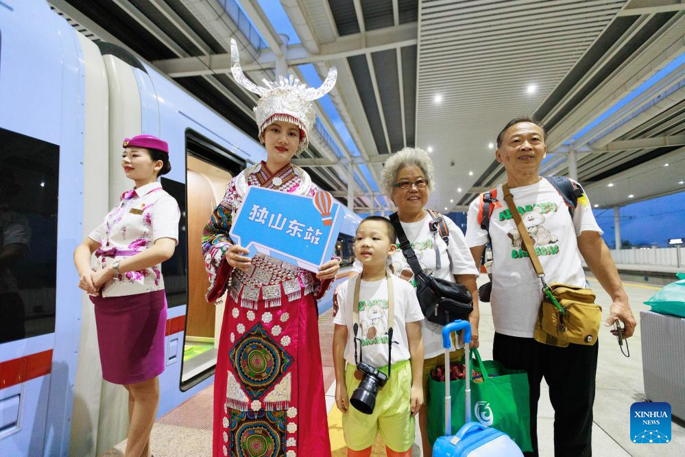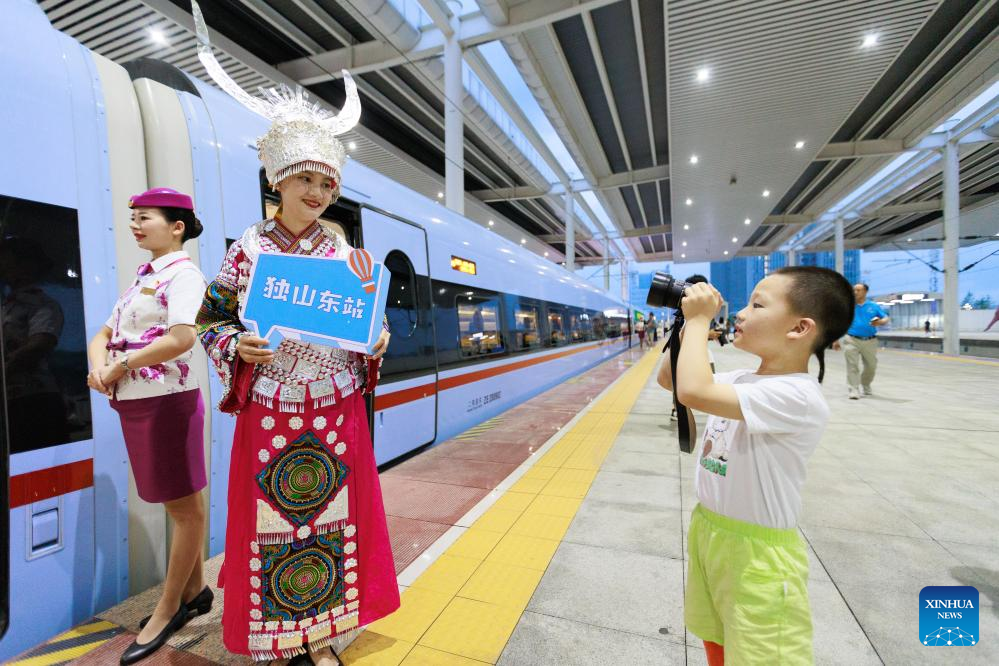GUIYANG, 8 ago (Xinhua) -- Un tren bala modelo Fuxing partió hoy martes por la mañana desde Guiyang, capital de la suroccidental provincia china de Guizhou, marcando oficialmente el inicio de las operaciones completas de la sección Guiyang-Libo.
