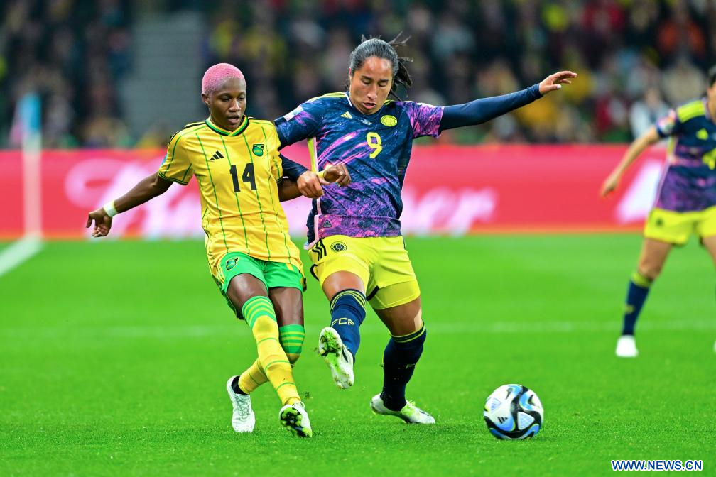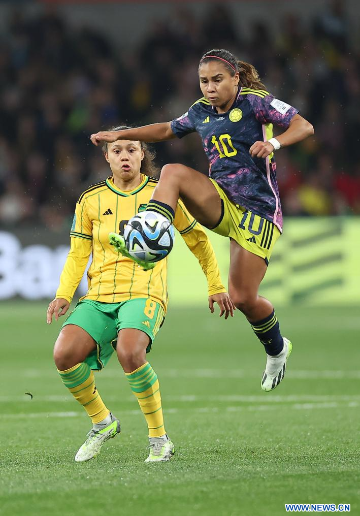 MELBOURNE, 8 agosto, 2023 (Xinhua) -- Leicy Santos (d), de Colombia, detiene el balón durante el partido de octavos de final entre Colombia y Jamaica en la Copa Mundial Femenina de la FIFA Australia y Nueva Zelanda 2023, en Melbourne, Australia, el 8 de agosto de 2023. (Xinhua/Ding Xu)