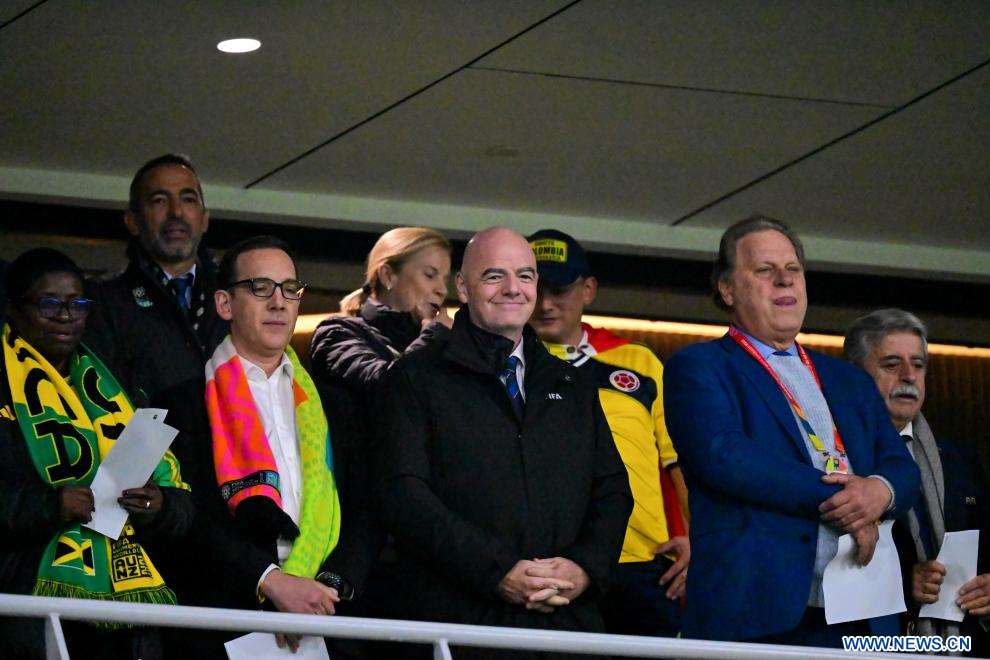 MELBOURNE, 8 agosto, 2023 (Xinhua) -- El presidente de la FIFA, Gianni Infantino (2-d-frente), observa el partido de octavos de final entre Colombia y Jamaica en la Copa Mundial Femenina de la FIFA Australia y Nueva Zelanda 2023, en Melbourne, Australia, el 8 de agosto de 2023. (Xinhua/Zhu Wei)