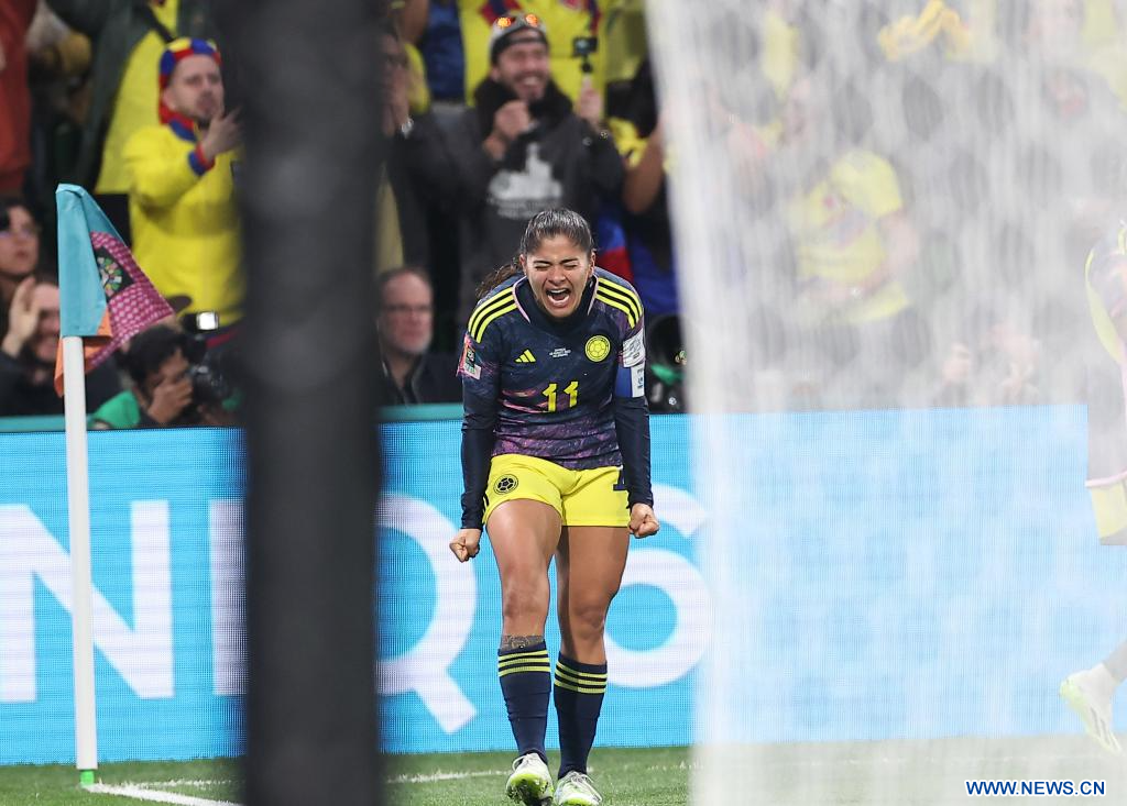 MELBOURNE, 8 agosto, 2023 (Xinhua) -- Catalina Usme, de Colombia, festeja una anotación durante el partido de octavos de final entre Colombia y Jamaica en la Copa Mundial Femenina de la FIFA Australia y Nueva Zelanda 2023, en Melbourne, Australia, el 8 de agosto de 2023. (Xinhua/Ding Xu)